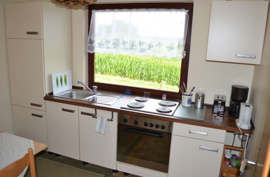Ausstattung: Einbauküche mit E-Herd & Backofen, Kühlschrank, Kaffeemaschine, Wasserkocher und Toaster